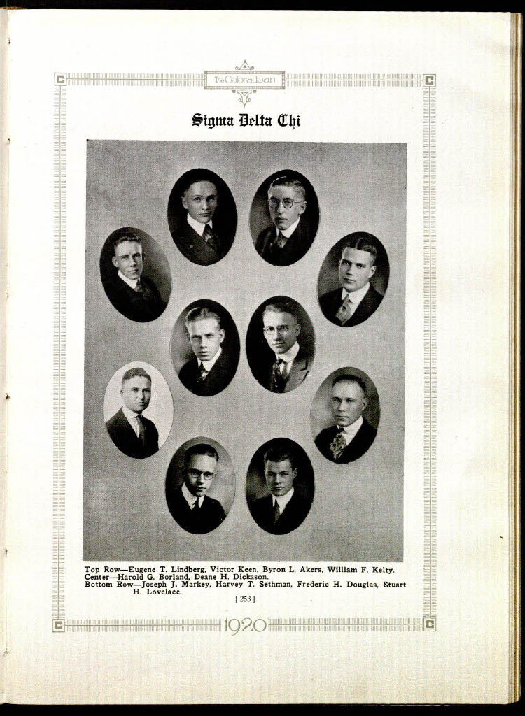 Most of the students pictured here, Borland included, were suspended for one year (Deane H. Dickason was expelled) for their part in the publication of a lampoon edition of the school newspaper Silver and Gold. The edition featured harmless jabs at campus staff and societies, including a good natured observation on an all-girl sorority: “The Chi Omegas are reported to be stepping out on the sorority house balcony at night with nothing but a bright light on.” Borland never returned to the University; he went home to Flagler where he worked for a year on his father’s paper The Flagler News. In 1921, he entered Columbia School of Journalism, taking his B.A. degree in Literature there in June of 1923. In 1944, Borland was awarded an honorary degree from the University of Colorado. Borland reflected on the suspension in an April 1970 Denver Post interview: