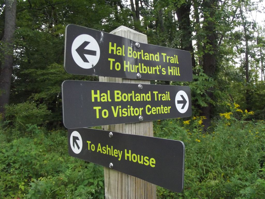 The entrance to the Borland trail lies directly across Weatogue Road from the entrance to the Cobble Visitor Center. As you walk the trail through Ashley Field–still farmed for hay today–you have a clear view before you of the lower Berkshires, just as Hal Borland and Waldo Bailey surely did on their visits in the 1950s and early 1960s. Borland wrote of his friendship with Bailey in his article “Rock Garden in a Cow Pasture,” published in the May 1975 issue of Audubon magazine: