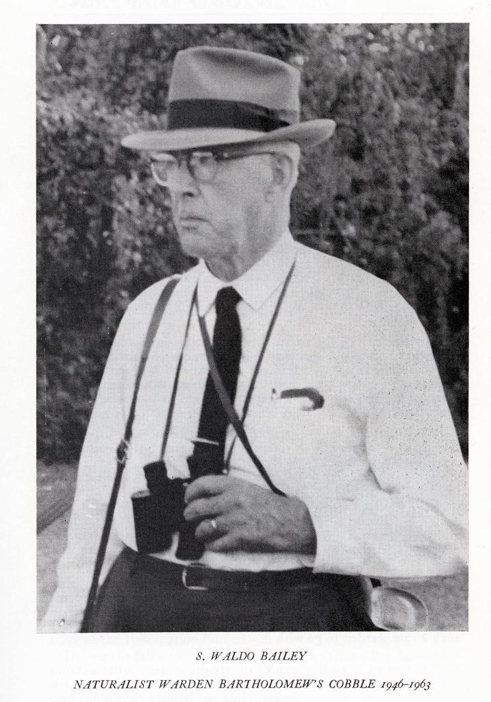 “Waldo Bailey practically was the Cobble when I first knew it. We had moved to the far northwest corner of Connecticut, and a neighboring farmer had mentioned ‘the Cobble.’ I asked what it was, and he said they used to picnic there when he was a boy, an old cow pasture that now was a nature reservation. So we drove up there, only a few miles, walked in, and were soon confronted by a big ruddy man in a gray fedora and a gray business suit complete with white shirt and tie. That was Waldo Bailey. When he saw that we knew a chickadee from a starling he gave us the run of the place, asking only that we be careful of the ferns. It was a dry year and the ferns had suffered.