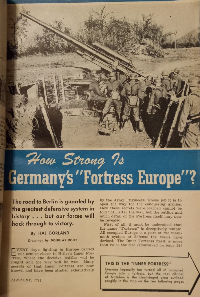 Borland resigned the Times in the summer of 1943 to freelance: “Several magazines wanted me to write for them. I left the Times with the understanding that I would continue on a semi-staff basis, accepting magazine assignments and other work as I pleased. . . .After I left the Times I did correspondence of various kinds for Popular Science Monthly, The Saturday Evening Post, and a dozen other magazines. Quite a bit of work for This Week mag; many others, general reporting as well as essays, usually on some nature phase. A number of pieces for Holiday, several for Reader’s Digest.” In his November 1943 Times article “Home Town Makes Good,” Borland revisited Flagler, Colorado, reporting on the changes made since he lived there in the late teens and early 1920s, and the young men of Flagler serving in the war. The January 1944 issue of Popular Science Monthly featured an in-depth Borland article on the intricate system of Nazi defenses constructed throughout occupied Europe–deadly barriers the allies would have to cross before reaching “Hitler’s Inner Fortress, where the decisive battles will be fought and the war will be won.” Borland also scripted film documentaries on Navajo Indians, nature and geology, and continued writing short fiction, including his story “Beaver,” published in 1944 in the Avon Modern Short Story Monthly alongside stories by Ernest Hemingway, John Steinbeck, Max Brand and Kay Boyle.
